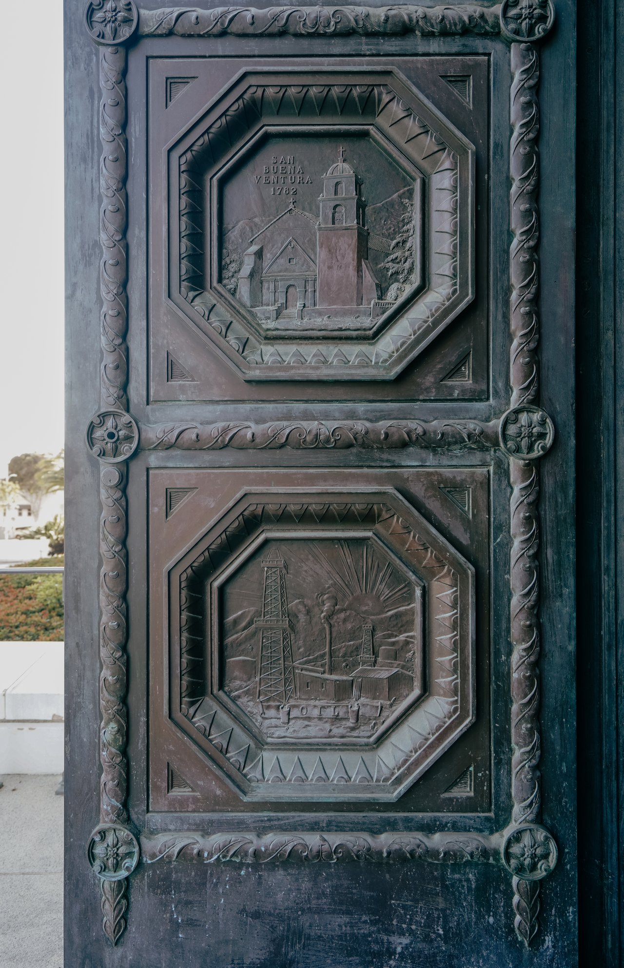 This Neoclassical courthouse was designed in the Beaux-Arts style. A grand granite staircase leads to the ornate bronze front gates. The façade is covered in white-glazed terra cotta panels, fluted Doric columns, Roman-arched windows, and topped with a copper-sheathed dome and cupola. Most notably, twenty-four carved terra cotta friars’ face keystones sit above the first-story windows. The hooded, mischievous faces are a nod to San Buenaventura’s history, being one of the nine original Mission towns founded by Father Junípero Serra and the Franciscan friars in 1782.